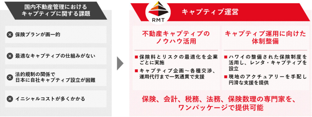 不動産企業が負うリスクと加入している保険の最適化という課題に対し、10年以上にわたる運営実績に裏打ちされた当社のキャプティブ運用ノウハウとレンタ・キャプティブの体制を元にトータル的に企業を支援します。